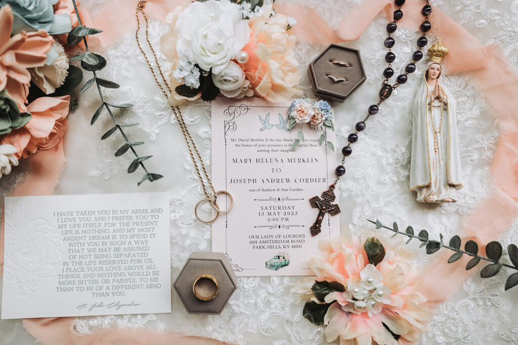 Their wedding details were so thoughtful, especially the statue of Our Lady of Fatima included in their flatlay. The day had some touching moments that made my heart squeeze. Mary’s mom passed away in 2020, but the couple made sure she was there in spirit. They placed a beautiful picture of her in the church pew, creating a space for her presence on this important day.